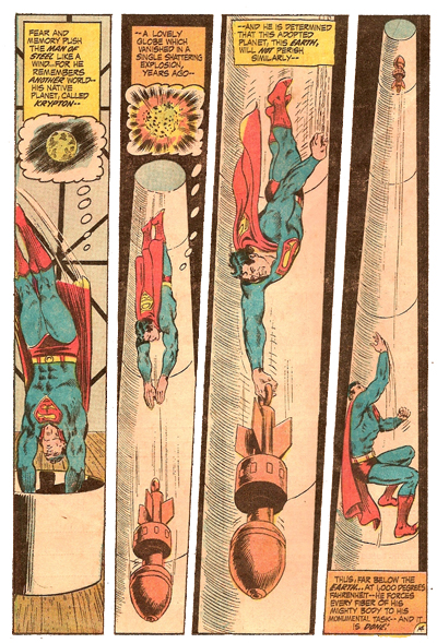 There is a sense that O’Neil is starting a trend that is a vital part of Superman’s comic book life even today. O’Neil is trying to find a way to make the character more relatable to readers, as if acknowledging that – in the era of The Amazing Spider-Man – an invulnerable flying alien is drifting out of touch with readers. So, as O’Neil strips Superman of his powers, he only increases the angst. “No-one knows yet that my powers are badly weakened!” he thinks. “I can barely fly — and I’m not certain my strength is equal to the job!” Later on, he reflects, “Yanking loose that vault-door was a major effort — for me… who once flipped planets around like marbles!”