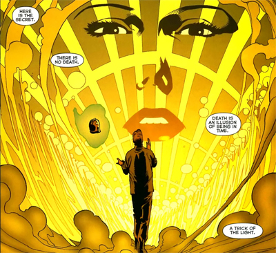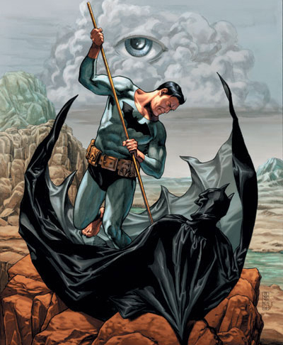 There’s also – appropriately enough for a book sandwiched between Infinite Crisis and Final Crisis – a whole host of interesting religious stuff. Given that Morrison wrote a book called Supergods”, it’s not too surprising, despite Bruce’s observation that “mixing religion with what we do is dangerous.” In a way, this feels like a set-up for Final Crisis, with a sense that a new religious order is taking shape – literal “New Gods.”