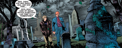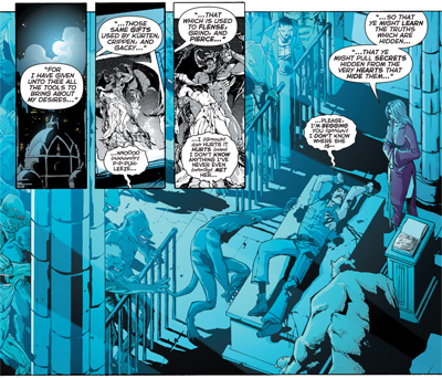 In a way, the Ten-Eyed Men seem like surgeons cutting out a cancer, suggesting some connection to Bruce’s late father, Thomas Wayne. You could also suggest that it’s a somewhat literal shout-out to Frank Miller’s rather iconic “I’m the surgeon” monologue from The Dark Knight Returns. While the absent heroes are never allowed to dominate 52, I do like that we get little glimpses at what they are doing during the missing year. I particularly like the image of Alfred conducting a choir in Cathedral Square in Gotham, suggesting that Bruce isn’t the only person who has found peace when Batman retired from his crusade in Gotham.