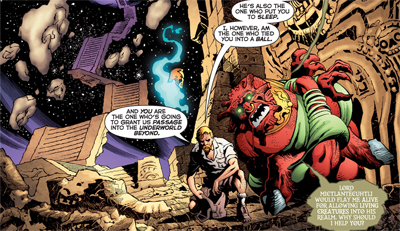 Early on, our intergalactic explorers are trapped on a planet Starfire describes as “heaven”, while Animal Man warns his colleagues about a “serpent” lurking in the bushes. Starfire, the only female member of the team, almost dooms them by eating the fruit from the trees. The group find themselves hunted by Devilance the Pursuer (“God of the Pursuit”), who accuses them of having unnatural knowledge. “You saw beyond the veil, beyond the two score and twelve walls of heaven. That knowledge belongs to the gods alone!”