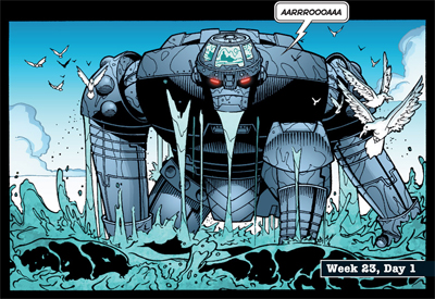 One plot thread (written by Grant Morrison) features the delightful image of DC’s mad scientists sequestered away on a desert island sipping cocktails and passive-aggressively sniping at one another. This is a prison/resort where the Thanksgiving dinner is carved with a chainsaw. It’s beautiful absurdity, and 52 seems to relish that approach to comics. At one point, Mercury – one of the Metal Men – invites his creator to stop being so serious about everything. “Hell, Doc, why don’t you just reanimate Platinum right now and we’ll all go fight weird science monsters like we used to!”