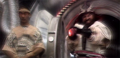 Apparently Martin was worried that audiences at home might somehow miss the subtext. So we get a few pointed references to Earth. For example, the Sixth Doctor proves quite an environmentalist. While examining the power generators, he notes to Peri, “As I suspected, a device for extracting energy from the sea. Something your planet had the technology to do long before its fossil fuels ran out, but they didn’t bother.” And then there’s the rather weird fact that the oppressed natives led by Tuza are presented as Native Americans. (And the fact that the majority of the Mentors’ slaves appear to black.)