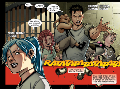 I actually like the scope of Divided We Fall. It’s a big universe-altering event spanning Marvel’s three Ultimate Universe titles, but it isn’t so granular or so tightly-wound that the three books are tripping over one another. Each of the three books involved tell their own side of the story. Each can be read independently, with no real dependence on the other two. There’s a sense that the creators involved are being allowed a reasonable degree of creative freedom, and that Brian Wood is crafting his own X-Men epic that doesn’t exist simply to tie into the headline-making decision to bump Captain America up to superhero-in-chief over in Ultimate Comics: Ultimates.