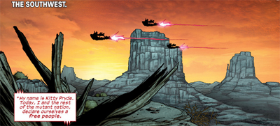 Fury tries to rally the mutants using patriotism. “This ain’t no third-world craphole. Never forget what we’ve got here, what we’re trying to preserve. What we need to preserve.” However, Kitty has been so bitterly disillusioned that she can’t even bring herself to identify as American any longer. “He means America. But I’m not here for that. I’m here to fight for mutantkind.” It’s a more subtle form of dissolution, but it’s just as corrosive.