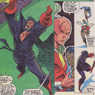 At one point, Cable has defeated the villain Black Tom. “Ye win, ye bloody scab!” the baddie admits, dangling over an edge. “Just pull me up an’ I’ll be surrenderin’!” Cable is having none of that. “So you can be arrested and escape in two months time to do this all over again? I don’t play that game, Cassidy!” Yeah, all that human rights nonsense! Cable only barely avoids killing Black Tom, thanks to the intervention of Deadpool. Later on, he kills Masque, and heads down to boast to the Morlocks about killing their leader.