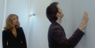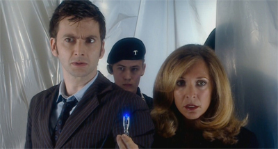Indeed, the Doctor’s fallibility is raised repeatedly throughout both Army of Ghosts and Doomsday, and there’s a sense that the Doctor is being made to pay for his hubris. When Mickey revealed that he travelled between universes, Rose notes, “The Doctor said that was impossible.” Mickey rather snidely, but not unfairly, responds, “Yeah, it’s not the first time he’s been wrong.” Tennant plays this sort of shortsighted and arrogant Doctor rather well, and his interactions with Tracy-Ann Obermann are particularly fun to watch. Especially the scene where the Doctor pulls up a chair to watch the latest ghost shift – calling Hartman’s bluff.