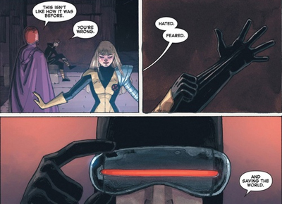Positioning Scott Summers as the heir apparent to Magneto (and Wolverine as the successor to Xavier) is a rather ingenious twist, and I’m surprised at how much sense it actually makes. After all, Scott has spent his entire life being taught by Xavier that mutants are the next evolutionary step and has seen human prejudice and hate first hand. That’s bound to mess him up. On the other hand, Wolverine came to Xavier fully formed, and Xavier healed him – made him a better man than he might otherwise be.