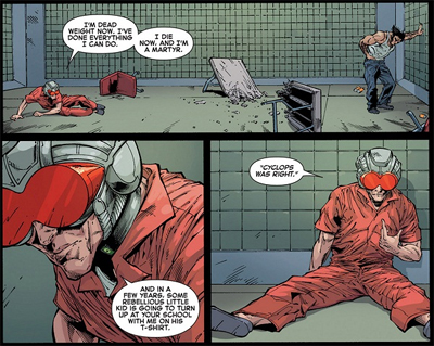 Still, Consequences is intriguingly candid about what it is doing. It’s a step backwards, an attempt to rewind a particular editorial direction for the franchise. Gillen channels Morrison quite overtly, with Cyclops overtly referencing Magneto’s martyrdom during that run, and suggesting that he may too be reappropriated by mutant subculture. “In a few years, some rebellious little kid is going to turn up at your school with me on his t-shirt,” Cyclops taunts Wolverine, making an explicit reference to Morrison’s New X-Men. “‘Cyclops Was Right’.”