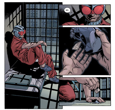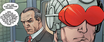 Gillen suggests that Cyclops is being stripped of everything that validated his earlier conduct. “You are just another criminal,” the warden explains, making reference to “the reemergence of mutant births” as the factor which makes him less special than he might otherwise be. Cyclops is no longer the guiding light he once claimed to be. He isn’t even the first mutant to be incarcerated in the prison. “Think of that,” the warden teases. “You’re not even prisoner one, Mr. Summers.”