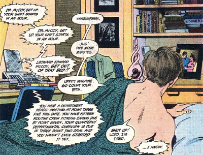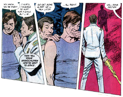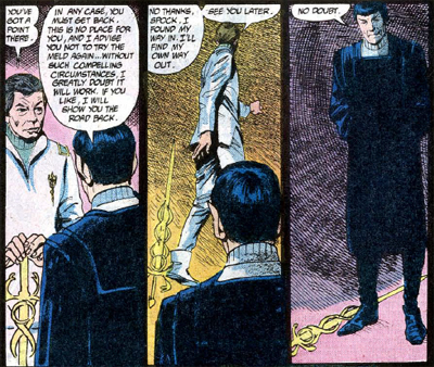 In many ways, The Last Word seems like an attempt to provide closure for the events of The Wrath of Khan, with Kirk and McCoy coming to terms with life without Spock. In particular, McCoy seems to struggle with his role on the ship without Spock to provide a counter-balance. Read in isolation, without any knowledge of the comics around it, The Last Word could be read as McCoy trying to accept that things change and that his friend is gone – gone in the more permanent sense than “reassigned to a Vulcan science ship.”
