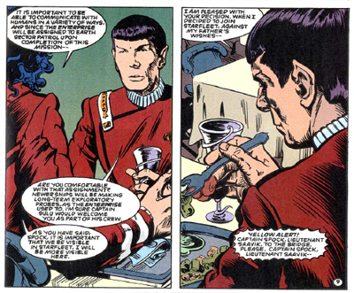 Barring a surreal detour involving the rescue of an Oberth-class ship, apparently forced on Wilson by editorial due to the edict that every story must feature suitably “Star Trek”-y action, A Question of Loyalty is pretty much a character-driven piece about how Saavik was squeezed out of the film series and replaced by Valeris. While artist Rachel Ketchum doesn’t necessarily work well with the characters in motion, she does excellent likenesses. There are several beautiful still shots of Saavik and Valeris, along with other members of the crew, even if their movements never seem especially organic.
