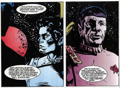 Wilson brings Valeris’ attitude to the fore using Saavik’s half-Romulan heritage. Of course, Valeris is quick to point out that she’s not being racist here. After all, she still respects Spock. “The difference is cultural, and your irrational behaviour today proves that you are part of the undisciplined culture into which you were born.” It’s a very cold and very rational viewpoint, one which doesn’t judge an individual based on their biology, but on the culture they ascribe to.