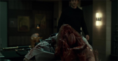 Buffet Froid is the most strikingly horrific episode of Hannibal to date. Of course, the show is very much a horror story and enjoys its fair share of grotesque imagery. This is the series, after all, that gave us the makeshift angels, the do-it-yourself cello and the human totem poll. However, Buffet Froid plays most obviously on the imagery and iconography of horror. This is the episode where people have no faces and skin comes off at the slightest touch and the serial killer is waiting for you under your bed.