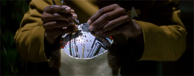 There has been some redesign work done on the sets for the film, and they look a lot more cinematic. Again, the bridge seems to borrow a few cues from Yesterday’s Enterprise. However, the real beauty is in the way that cinematographer John A. Alonzo shoots the sets. Unfiltered sunlight seems to pour through the window, lending the whole film a decidedly golden hue which makes the Enterprise look much more vibrant and cinematic than it did on the small screen. There’s beautiful use of shadow and space. Even if the movie isn’t written to feel cinematic, it looks cinematic.