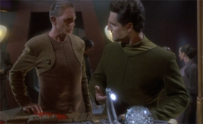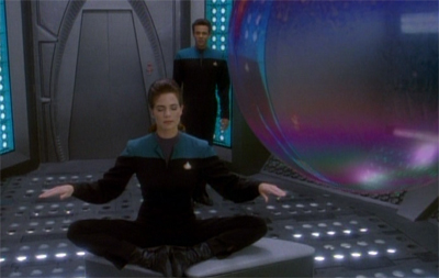We’re introduced to Dax trying to balance her zen a bit, and she’s presented as relatively aloof. Discussing romance, she comments, “It’s a weakness of the young, and although a Trill host may have these feelings occasionally, it is our wish to live on a higher plane, to try to rise above these kinds of temptations.” That seems quite different from the version of Dax who appears in the second season, or the one who enjoys playing pranks on Odo in Homefront, or who can’t wait to bump nasties with Worf.