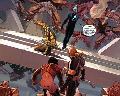 There are a rake of other clever ideas as well, as Hickman draws on half-a-century of Marvel comics for inspiration. Positing “no more mutants” as a genetically-engineered plague seems a like a very smart development in the era of “superpowers as nuclear weapons”, and arguably makes a great deal more sense than the contrived retcon at the end of House of M. (It’s interesting how so many of the radically revised ideas in Hickman’s Ultimate Comics: Ultimates run are rooted in how shabbily Marvel treated Morrison’s superb New X-Men.)