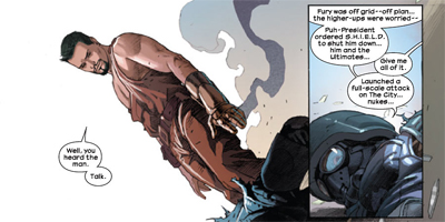 Perhaps due to the declining sales across the line, editorial seems a lot more willing to allow writers in the Ultimate Universe to shake things up. Hickman is able to destroy most of Eastern Europe without missing a beat. He is able to write about a super-human coup in South-East Asia. Although he makes up a country, the location is explicit. This isn’t Magneto’s fictional island of Genosha. This is a real place turned into something hyper-real. Hickman doesn’t limit his storytelling to the far side of the world, either. His Ultimate Comics: Ultimates really radically shakes up the status quo of the United States.