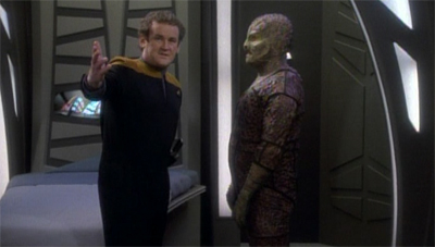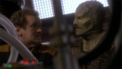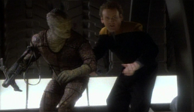 There is also another nice little irony buried early on Captive Pursuit, one that only really becomes obvious in hindsight. Discussing the wormhole with O’Brien, Tosk notes, “Others will detect ships from your quadrant as I did and follow them here.” He seems to mean it more as a warning than as an idle observation, and it’s easy to read a great deal of subtext into the remark. O’Brien smiles and offers a very Star Trek answer, “We hope so. Our mission as Starfleet officers is to seek out new life forms so we can learn about each other.” I bet he regrets that in about five years time.