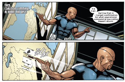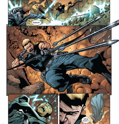 Hickman does give the miniseries a hint of character focus. We discover, for example, that this version of Hawkeye is a mutant – whether he has an X chromosome or not. His ability to shoot with pinpoint accuracy is due an abnormal number of rods and cones in his eyes. We also get to see a bit of his history with Nick Fury, a hint at the bond of loyalty that exists between the pair. (As well as cementing the idea, solidified by Mark Millar’s Ultimate X-Men, that The Ultimates is really rooted in post-Gulf War America, a by-product of the nineties carried into the post-9/11 status quo.)