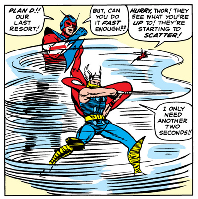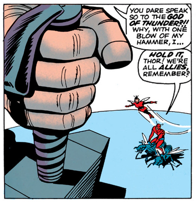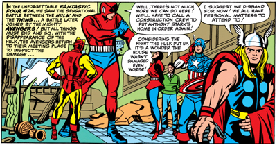 Darren, I recently reread that last paragraph, and you said that The Avengers was detached from the rather grounded universe at the time. My personal theory is it is intentionally written this way. A superhero universe gradually starts out realistically like our world, but grows more fantastic as it goes along. A point where several characters form a team shows that the world has been fundamentally changed by them. I.e. in some early Fantastic Four issues bystanders are surprised to the members claiming they were too far out to possibly exist. These issues, published around 2 years later, casually report Thor fighting Giant Man in the center of the city.