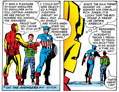 Similarly, these early Avengers comics touch on some rather dark undertones. Although one suspects that Lee never intended the scenes to be quite as disturbing as they are, the relationship between Captain America and Rick Jones is downright creepy. Bringing Captain America into the modern age, Lee had made the shrewd decision to kill off the character’s teenage sidekick, Bucky – decades before Jim Starlin would kill off a Robin in A Death in the Family.