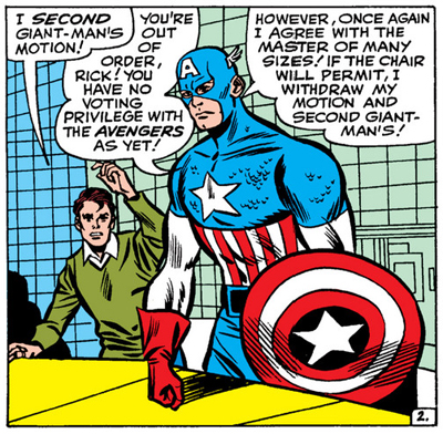When Hawkeye shows up in The Old Order Changeth, Iron Man offers, “I’ll give you an Avengers Manual so you can study our by-laws!” Apparently, to qualify for membership, Quicksilver has studied their “case history.” They argue over procedure and who happens to be chairing individual meetings. As they arrive, ferried past adoring crowds, Ant-Man protests, “I was chairman of the last meeting! Whose turn is it this time?”