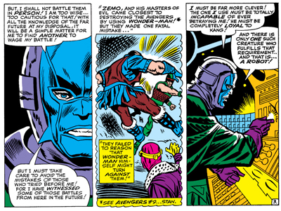 More interesting, albeit less pronounced and developed, are the wonderful Kirby influences. Jack Kirby’s tenure on the title ran for the first eight issues and then two more. As a result, his impact on The Avengers as an entity in and of itself is not quite as great as his influence on many of the individual members. In particular, Kang the Conqueror and his out-of-time army seems like a delightful Kirby concept that is never developed as thoroughly or as sufficiently as it should be.