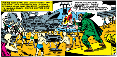I have a massive fondness for Kang as an Avengers villain, but I’d argue he has always had difficulty living up to his potential, introduced in the last issue of Kirby’s introductory eight-issue stint on The Avengers. Similarly, I suspect Kirby was behind the story involving the lava men and the giant exploding stone buried beneath the Earth’s surface, as well as the storyline involving Captain America’s arch nemesis Baron Zemo hiding himself in South America.
