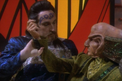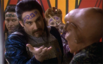 So instead of seeming like a strange new species, the Wadi come across as manipulative sociopaths. When they introduce Chula, they present Quark with a dice. “Roll?” he asks. “But you haven’t even told me the rules yet.” Falow snidely responds, “You’re required to learn as you play. Roll.” Joel Brooks actually does the best he can to make Falow seem menacing while still a little camp, but that’s just ridiculous. Under normal circumstances, forcing somebody to play a game they don’t understand is a little bit dickish. When you’ve kidnapped four of their friends, it crosses the line into sadistic.