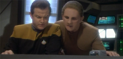 Indeed, Sisko comes across as just a bit of an ass here. It seems that he doesn’t like Bashir, which seems to fit with most of the cast’s reactions to the character. Kira seems to barely tolerate him (as seen in Emissary and The Passenger), O’Brien has issues with him, Dax seems flattered by his romantic intentions in a patronising way, and it’s clear that Sisko isn’t overly fond of his medical officer either. In Past Prologue, he didn’t seem to take Bashir’s interactions with a former Cardassian spy particularly seriously, as if doubting that Bashir could cause any risk to Federation security, even if he set his mind to it.