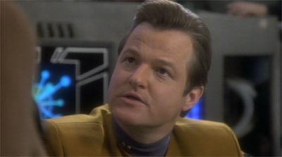 Still, there is something quite appealing about the concept of Primmin, and I’m glad that the show would return to the concept once it had grown up a bit. It’s probably a bit too early to be introducing guest stars who step on the toes of our regulars, and there’s the risk of introducing redundancy into a young cast, but it’s something very worth exploring. Lashley just isn’t the man for the task, and Primmin would work much better when he showed up as Eddington, a character just as banal and boring, but much more convincing as a Starfleet security officer.