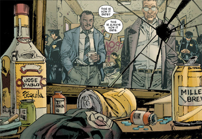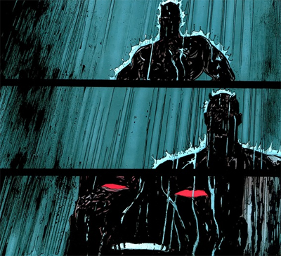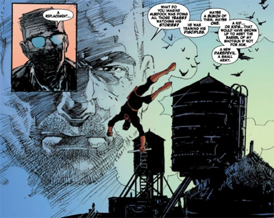 Because, beneath the homages and the shout-outs to The Dark Knight Returns, what is really interesting about End of Days is that it represents a clear reversal of that classic comic. It feels more like a rebuke to that particular story, a none-too-subtle rejoinder and a quiet rejection of the mood and atmosphere that The Dark Knight Returns brought to mainstream American comic books. After all, Daredevil seems the perfect character with which to make a counter-argument.