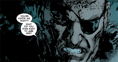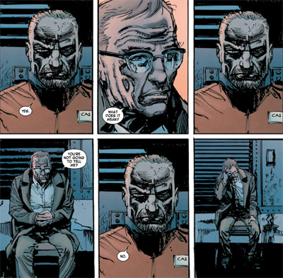 The rise of the Punisher’s stock is arguably one of the most obvious demonstrations of the shifting paradigm. His climb up the sales charts and into the A-list coincides almost perfectly with an obvious darkening of mainstream superhero comic books. The Punisher himself, locked up and chained to a chair, boasts of his influence to Ulrich. “I couldn’t be more proud of him if he were my own son,” he tells Ulrich, as if positioning himself as the father of this particular movement in comics.