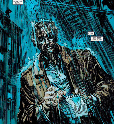 The message is quite clear: the dystopian world teased by Miller in The Dark Knight Returns has arrived. This is particularly true in comic books, which have been living in a pale imitation of Miller’s dark alternate world for quite some time here. Despite the fact that Daredevil brands the book, the central character of End of Days is Ben Ulrich. Ben Ulrich is a reporter, but he is primarily – as we’re assured by other characters repeatedly – “a writer.” He’s a writer trapped inside a dark comic book world with nothing but darkness and despair.