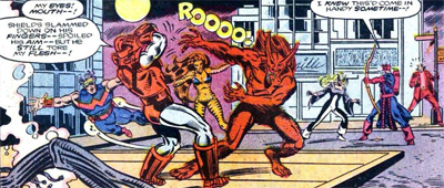 This is bad enough by itself – there’s a rather creepy undercurrent to Englehart’s decision to cast Tigra’s sex drive (absent from the other female members of the cast) as completely negative. However, it gets worse when he decides to throw feminism into the mix. Kissing some random guy in Los Angeles, Tigra muses, “Whatever other failings I may have, I do like men–! And men like me! I’d never have been this free if I’d stayed Greer Nelson the feminist!”