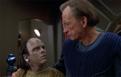 In a nice touch, the episode ends with Garek greeting a station resident in the background who seems to be Bajor. He’s too far to see the ridges and the short sequence takes place in the background of a shot focusing on Bashir, but he’s a human-esque figure in civilian clothes. It’s a nice, subtle coda to the episode which suggests that perhaps the healing is beginning to occur, and that perhaps these old wounds might eventually start to ache a little less.