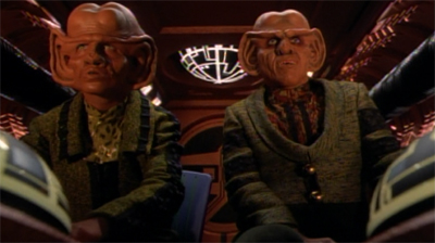 Any way, the truth is that Rules of Acquisition probably doesn’t take place in a culture as far away from our own as we’d like to think. It’s worth noting that this the first time that the institutional sexism of a major race has been properly dealt with. The Klingons are also sexist. Despite Gowron’s promise to K’ehleyr in Reunion, it seems that women cannot hold high office in Klingon culture. In Redemption, the Duras sisters need a nephew to make their claim. In House of Quark, a widowed Klingon runs the risk of losing everything she owns.