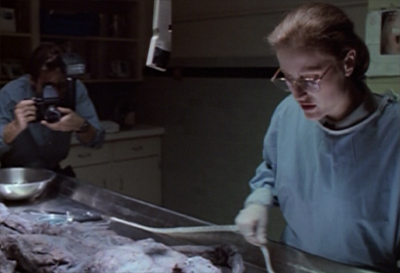 Carter even borrows several of the film’s cues here. One of the most memorable sequences in The Silence of the Lambs features Clarice attending the autopsy of one of the victims in a local morgue. The male police officers seem quite uncomfortable with a female character doing such work. Rather notably, as a medical doctor, Scully spends a great deal of The X-Files doing autopsies and the more grisly medical work.