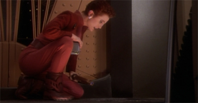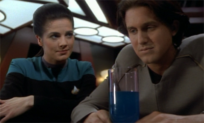 It works a lot better. Part of that is down to the fact that Terry Farrell always looked distinctly uncomfortable playing the wish old mentor figure. Standing tall with her hands behind her back, Farrell gives Jadzia a sense of definition and age, but she doesn’t quite have the screen presence to anchor a scene while just passively standing there. Farrell works a lot better when given scripts with a bit of energy, and the characterisation makes a great deal of sense – after all, this is a person who has lived for centuries, why wouldn’t she be adventurous and outgoing?