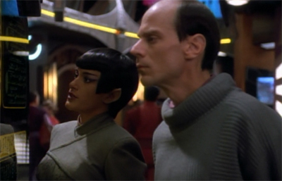 This is a nice little scene which actually says a lot. For one thing, the ensemble is so well developed that Odo can have an outburst like that both without seeming entirely out-of-character and without becoming completely unsympathetic. We might not agree with his philosophy, but we understand it. There’s also a clear sense of unease in the working relationships here. While The Next Generation felt like the most professional workplace in television, Deep Space Nine has a lot of friction that comes with an approach welcoming philosophical diversity.