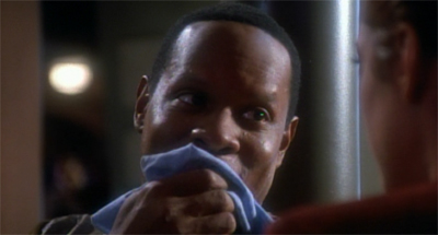 We also get glimpses at various other characters. mirror!Odo is finally indulging the fascism that has been hinted at over the past two seasons, complete with pimp slaps and sarcastic humour. This version of the character appears to value order above the concept of justice, and he’s implicitly corrupt. Although Kira professes a fondness for him, he seems to be part of Garak’s conspiracy. “It’s a shame this is going to be your last night on the job,” he teases Bashir.