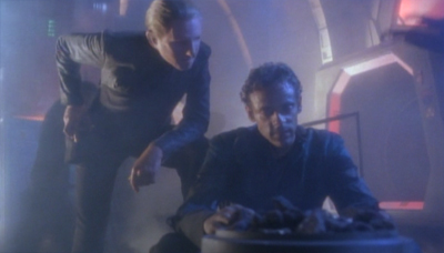 So, on the surface, Crossover is really just a pulpy fun adventure where our heroes visit an alternate universe where everything they know is wrong. It’s an excuse for actors to have some fun with the roles they’ve spend the past year-and-a-bit establishing, and a chance to skew audience expectations a bit. It’s an invitation for Avery Brooks to go gloriously over the top, and for Nana Visitor to amp up the sex appeal. (Indeed, part of me suspects the genesis of Crossover was the charm of Dramatis Personae, which gave the actors similar free reign.)