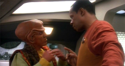 The Jem’Hadar is pretty much a mission statement from Behr. Most obviously, it finally brings the conflict between Quark and Sisko to a head, allowing Behr to explicitly state what he’d been heavily hinting at since The Nagus: the treatment of and attitudes towards the Ferengi suggests that the Federation aren’t quite as perfect and flawless as they might like to think. Behr has been fairly explicit about Sisko’s lack of tolerance towards the Ferengi way of life, and here he has Quark call Sisko out on it.