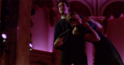Just as contrived and convenient is the hostage taken by Barnett in the theatre. Shots have just gone off in the lobby, and this musician is still hanging around. More than that, though, she isn’t suspicious enough to notice the man with the gigantic gun storming down the aisle after her? (And, of course it’s a damsel in distress, because Mulder’s martyr complex wouldn’t be heightened if he’d grabbed the pianist.)