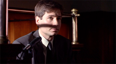 Instead, Young at Heart gets all daytime soap opera on us. It turns out that Mulder used to play by the rules, until playing by the rules got a fellow agent killed. “An agent died because I screwed up,” he succinctly explains. Reggie takes Scully through the play-by-play, explaining that – at one point – Mulder has the perfect shot at Barnett and his hostage. But he didn’t take it. “Because it’s not by the book,” Scully explains. “Mulder never forgave himself for that,” Reggie concedes. On the witness stand, asked about the shot, Mulder explains, “Well, it’s against F.B.I. regulations to unnecessarily endanger the life of a hostage.”