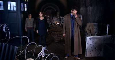 You can see that in the structure. The episode contorts a bit to get the basic set-up working. The Doctor’s hand summons them to create Jenny, but why now? Why not any other time the Doctor got in the TARDIS since The Last of the Time Lords? And then we need a reason for why the two armies are only finding “the Source” now. Having the Doctor conveniently uncover “a new map, a different set of tunnels” while broadcasting to both sides feels rather trite. It’s the most efficient way of covering the necessary ground in the time allotted, but it feels clumsy.