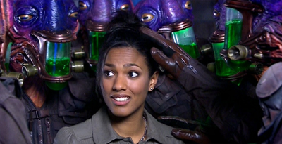 It’s a very weird dynamic, and it makes you wonder what the point of Martha guest-starring in this episode was. She didn’t want to go with the Doctor at the end of The Poison Sky, and she doesn’t want to go with him at the end of The Doctor’s Daughter. There’s no real arc there, no real change. Then again, the fact that the only thing that Doctor Who could do to wrap up her character arc in The End of Time, Part II was to pair her off with Mickey Smith suggests that the show never had any idea what it was going to do with Martha, but that it was nice to have Freema Agyeman around.