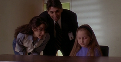 Still, that’s one effective hook and sequence in a single forty-minute episode. Everything else about Born Again feels fairly paint-by-numbers. The show can’t even seem to ratchet up suspense at the act breaks. Mulder closes out the first act by declaring “that little girl saw a ghost.” We’re on The X-Files. Seeing a ghost (or realising that somebody saw a ghost) is not a strong enough beat to cut to commercials. (In fact, it would be more surprising if she hadn’t seen a ghost.)