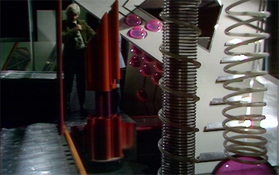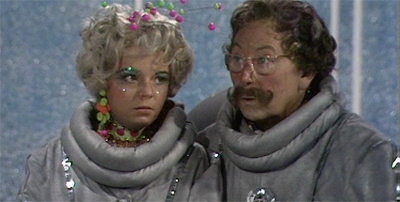The first real sense of colour we get on Inter Minor occurs when Vorg and Shirna cast off their functional grey space suits to reveal wonderfully tacky brightly-coloured outfits that seem to exist for no other reason than to assure viewers at home that the colour on their television set is working. Holmes seems to accept the reality that any attempt to show the universe on the budget of Doctor Who will look absurd, and so he embraces it wholeheartedly.