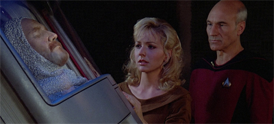 The body swap is a science-fiction standard. The original Star Trek did it quite a few times, including the final episode – the dire and incredibly sexist Turnabout Intruder. The Next Generation has already done a few variations on the “possession” theme, with various crew members serving as a conduit for an alien intelligence in Lonely Among Us and mind-controlling parasites infiltrating the Federation in Conspiracy. Data has already been a victim of a swap, with his evil twin brother taking his place in Datalore. (Using the same mechanism that Graves does here.)